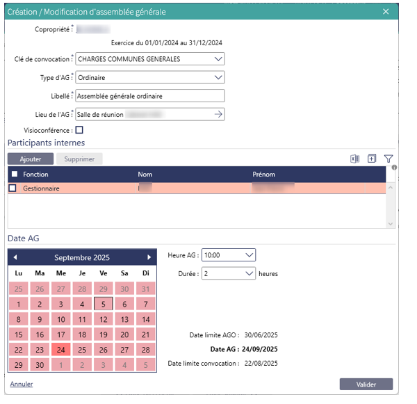Ensuite dans les 2 cas, une fenêtre « Création / Modification d’assemblée générale » s’ouvre :