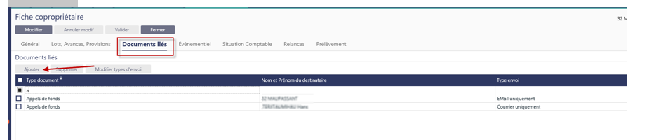 Depuis la fiche copropriétaire dans l’onglet « documents liés » ajouter le type de document « Appel de fond » et rattacher l’autre tiers en destinataire.