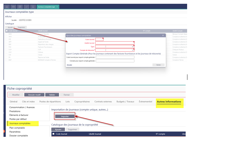 Depuis le menu Syndic-> Roue crantée -> Journaux Comptable Type : ajouter le journal souhaité ainsi il vous sera proposé à l’import sur toutes les copropriétés.