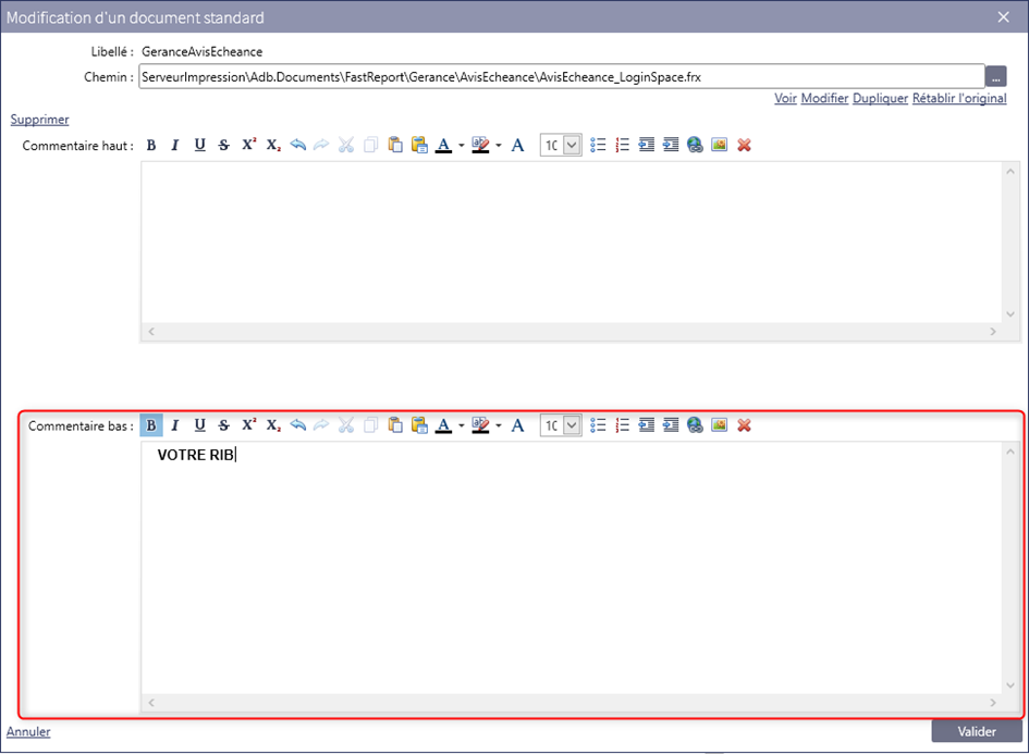 - Ajouter votre RIB dans la zone « Commentaire bas »