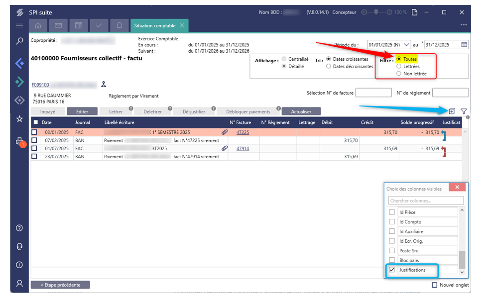 Dans le compte du fournisseur, il faut choisir « Toutes » dans le filtre et rajouter la colonne « Justifications » (apparait une colonne avec des flèches de couleur) :