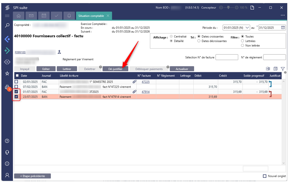 Ensuite il faut déjustifier la facture du paiement en cochant les 2 écritures et en cliquant sur le bouton « Dé-justifier » :