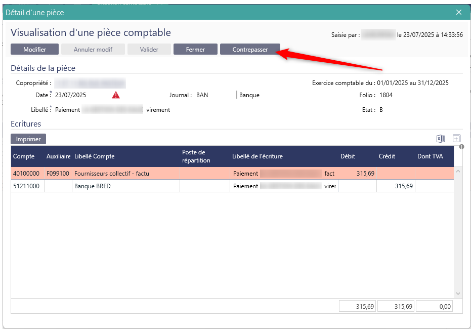 Si le paiement n’a pas encore été réellement fait alors il faut aussi annuler le paiement en double cliquant sur la ligne et en contrepassant :