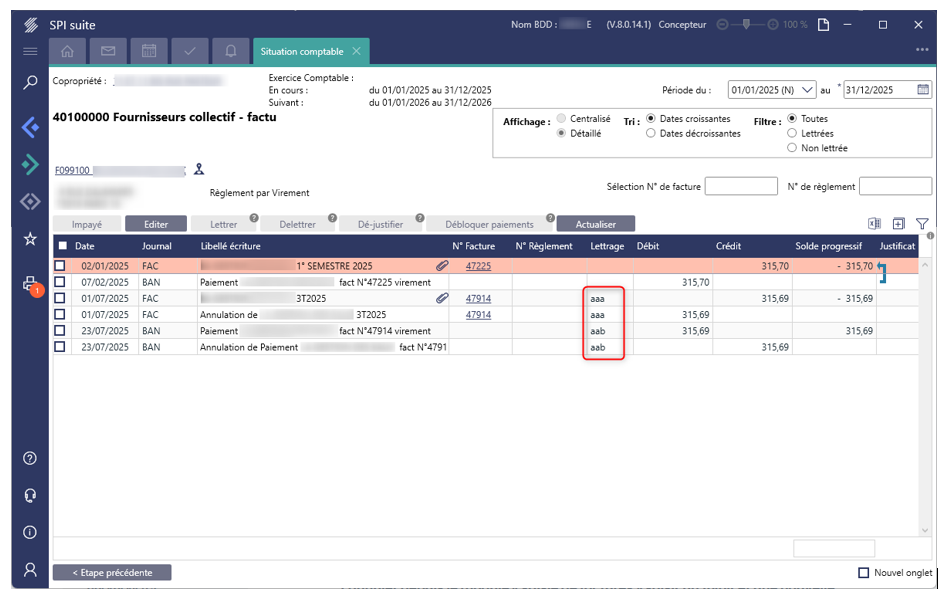 Toutes les écritures contrepassées sont donc annulées et lettrées automatiquement :