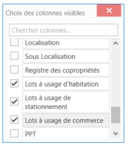 Rajouter les colonnes « Nombre de lots », « Lots à usage d’habitation », « Lots à usage de stationnement » et « Lots à usage de commerce » :
