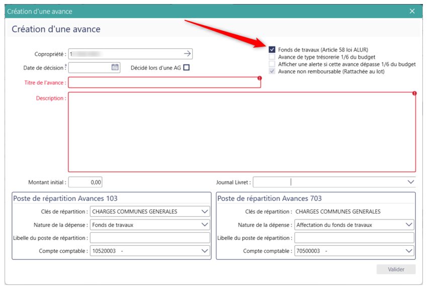 Création d’une nouvelle fiche en cochant « Fonds de travaux (Article 58loi Alur) » et en utilisant la même clé de répartition que dans la fiche compte 103 :