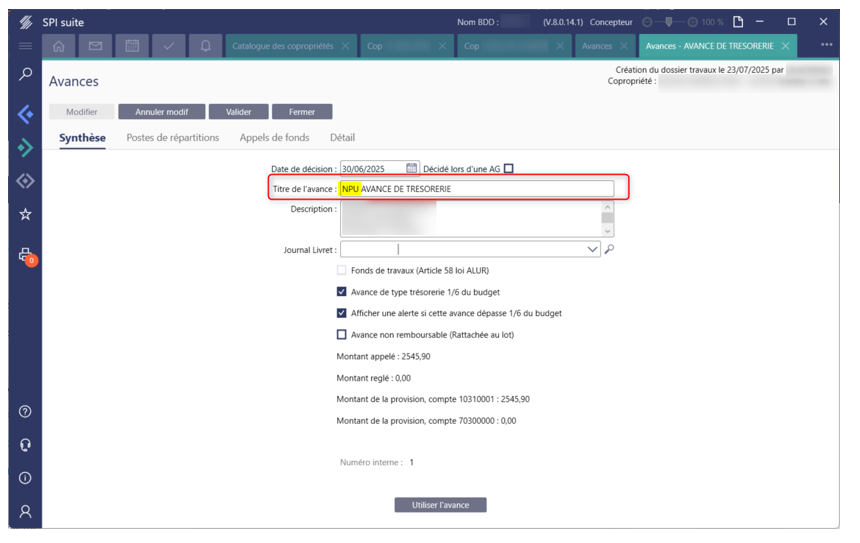 Enfin changer le titre de l’avance dans la fiche compte 103 en mettant « NPU » pour ne plus l’utiliser :