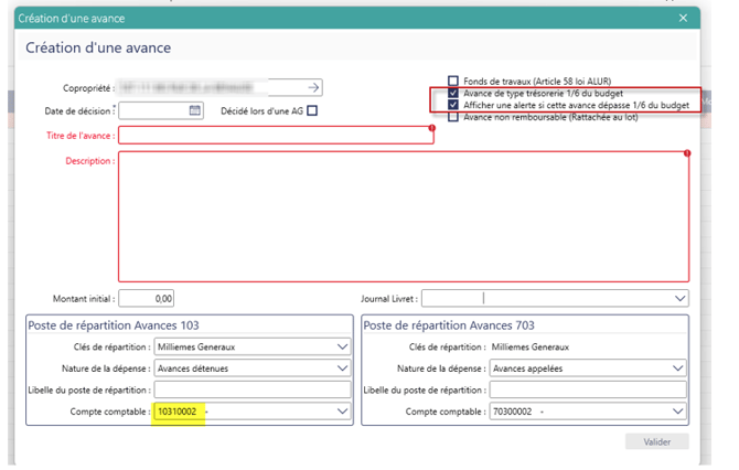 Titre de l’avance : zone obligatoire, le poste de répartition reprendra le même nom par défaut.