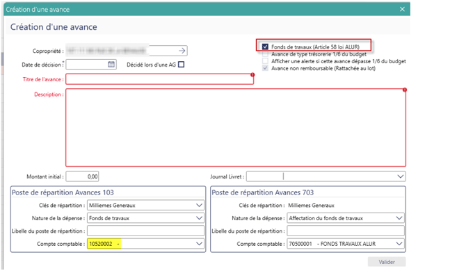Fonds de travaux (Article 58 loi ALUR) : cochez cette case, si cette avance correspond à une avance fonds ALUR.