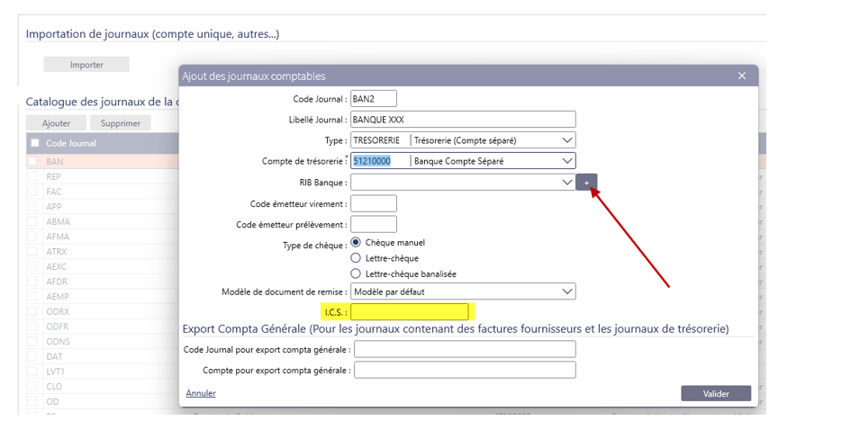 2-créer un journal de trésorerie avec un nouveau code (BAN2 ou autre code souhaité) rattacher au n° de compte comptable créé + renseigner le n° ICS. Puis créer le RIB dans à l’aide du bouton (+)