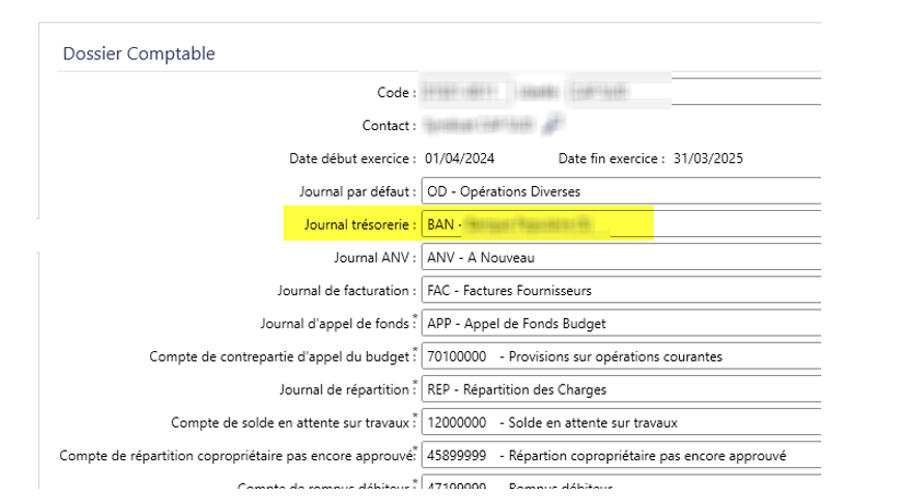 5-sur la fiche copropriété -> Autres informations : dans l’onglet « dossier comptable » rattacher le nouveau code BAN au journal de trésorerie. Sur la fiche copropriété dans l’onglet général apparaît le nouveau journal de Trésorerie.