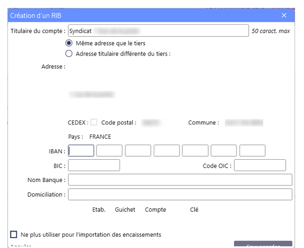 Renseigner les informations manquantes comme le RIB à créer ou à sélectionner dans le menu déroulant :
