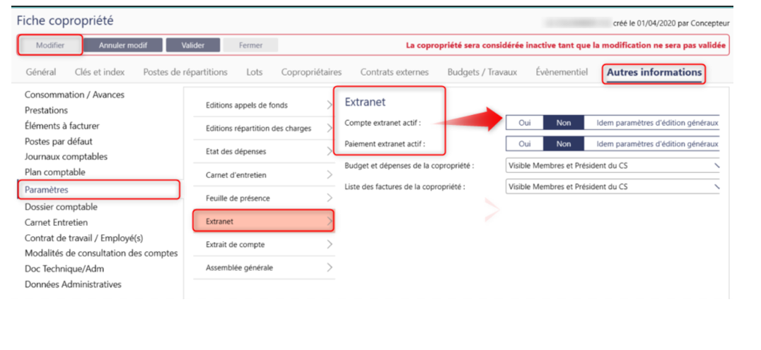 Dans le catalogue des copropriétés , vous devez effectuer le paramétrage individuel :