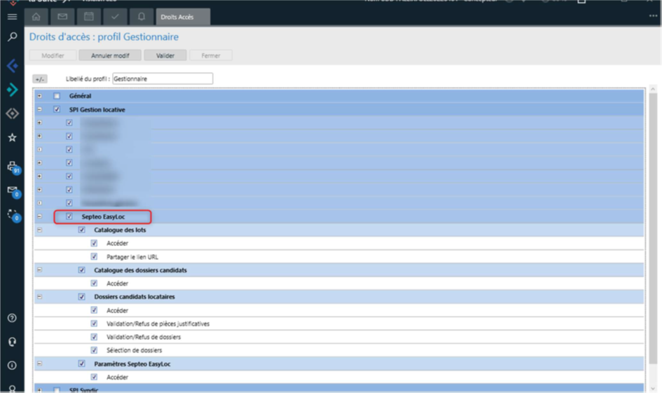 Comment gérer les droits EASYLOC ? Droits d'accès EASYLOC Depuis le menu « Droits d’accès » Double cliquer sur le profil Cocher ou décocher les cases de la section Septeo Easyloc