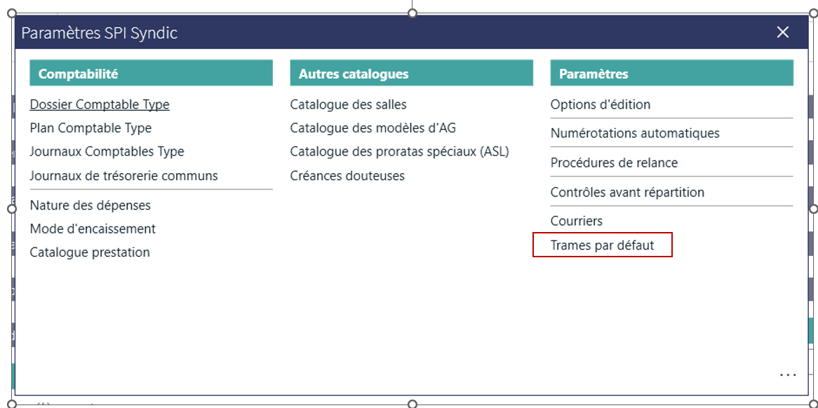 1/ Aller dans Syndic / Menu des paramètres (roue crantée) / Trames par défaut