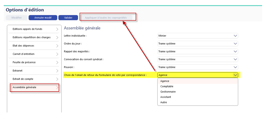 Menu Syndic-> Roue crantée -> Options d’édition : Assemblée générale