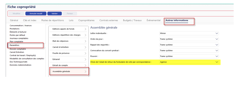 Depuis la fiche de la copropriété -> Autres informations -> Paramètres : Assemblée générale