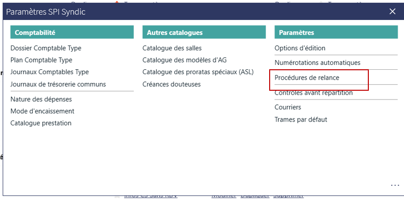 1/ Aller dans Syndic / Menu des paramètres (roue crantée) / Procédures de relances