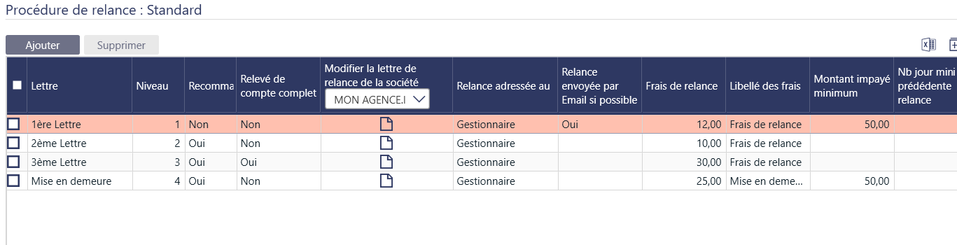 3/ Double cliquer sur la ligne à modifier, une fenêtre s’ouvre avec les éléments de procédure de relance : modifier la case « Montant des frais de relance »