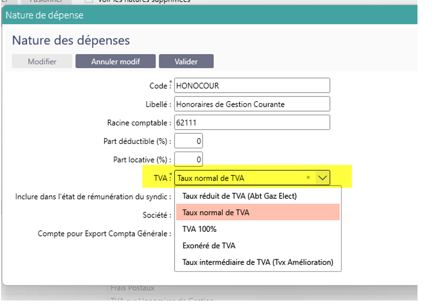 Menu commun-> Roue crantée -> Natures de dépenses + ouvrir la nature de dépense et Modifier la TVA.