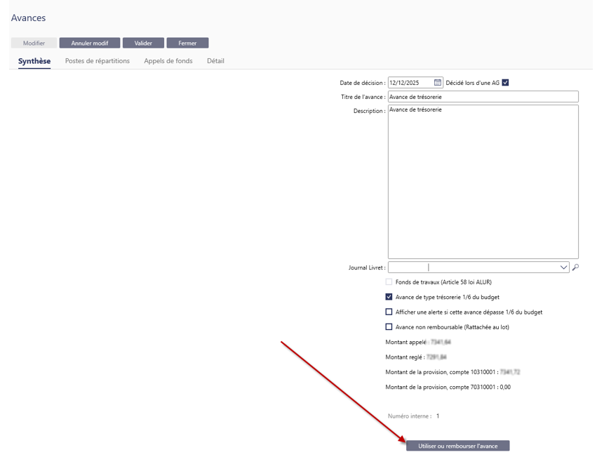 Ouvrir la fiche avance. En mode Modifier utiliser le bouton « Utiliser ou rembourser l’Avance ».