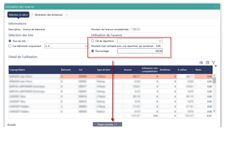 Utiliser le pourcentage pour rembourser la totalité de l’avance détenue.