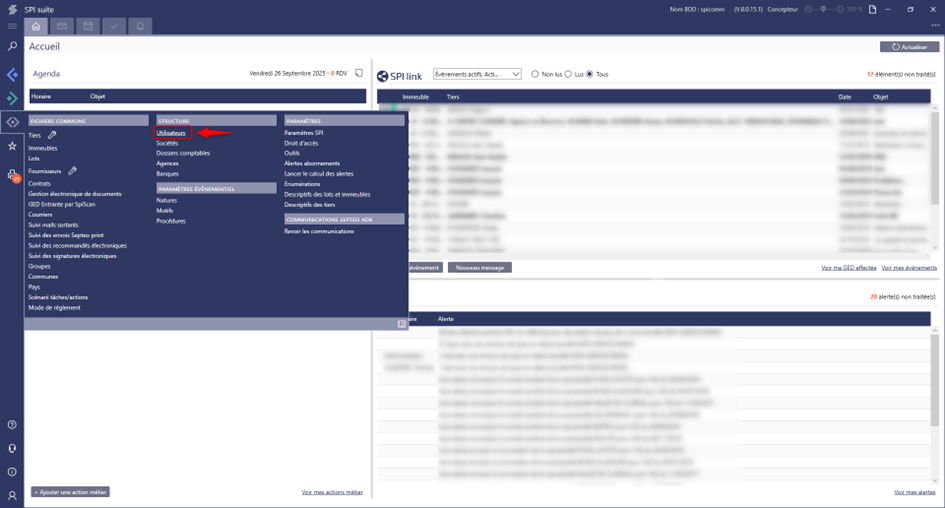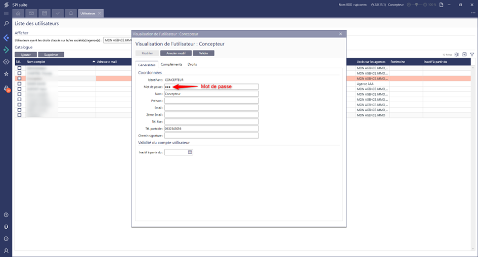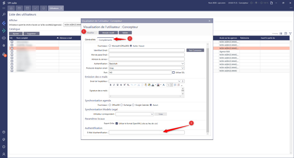 L’e-mail de connexion est l’e-mail renseigné dans le module « Utilisateurs » du menu commun puis l’onglet « Complément » de l’utilisateur sélectionné sur SPI (il n’est pas possible d’utiliser plusieurs fois la même adresse mail).