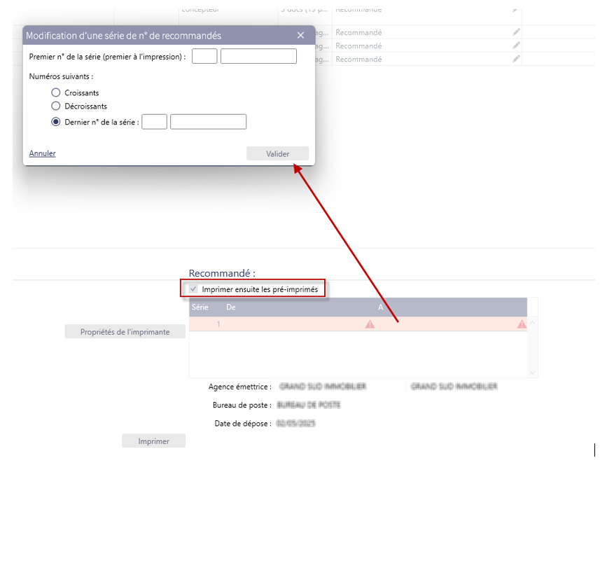 Générer les documents à envoyer en recommandé dans le spool d’impression puis double cliquer sur la série de n° de recommandés à modifier.