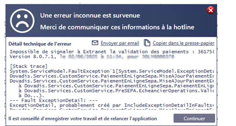 Comptabilisation des prélèvements bloqué par un message d’erreur « impossible de signaler à Extranet la validation des paiements »