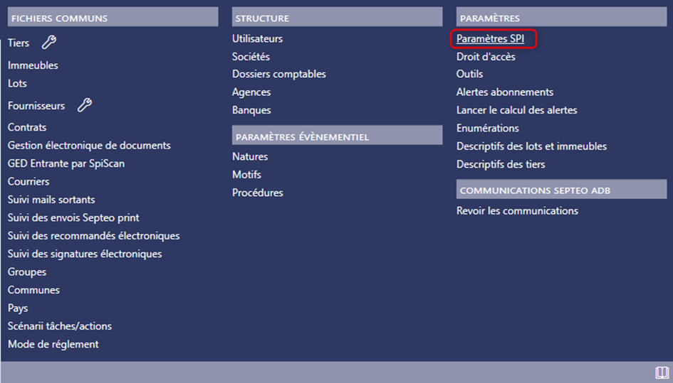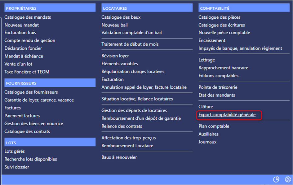 Dans le menu SPI Gestion locative, dans la colonne « Comptabilité », on sélectionne le menu « Export comptabilité générale »