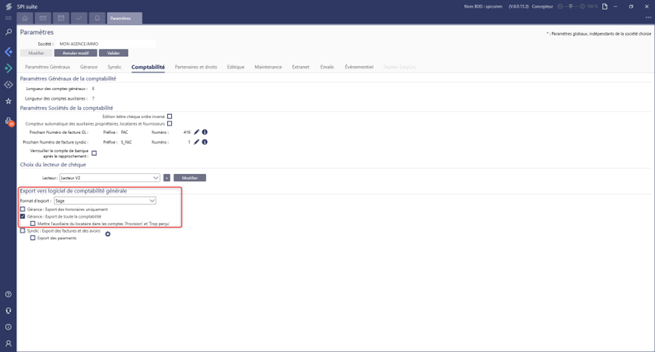 Ce menu permet d’exporter l’ensemble de la comptabilité SPI dans un fichier pouvant être intégrer dans la comptabilité générale de l’agence.