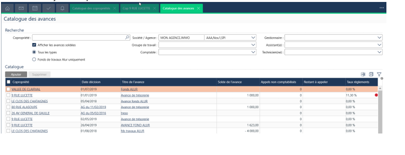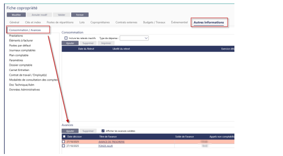 Depuis le Menu Syndic dans la colonne copropriétés cliquer sur Avances