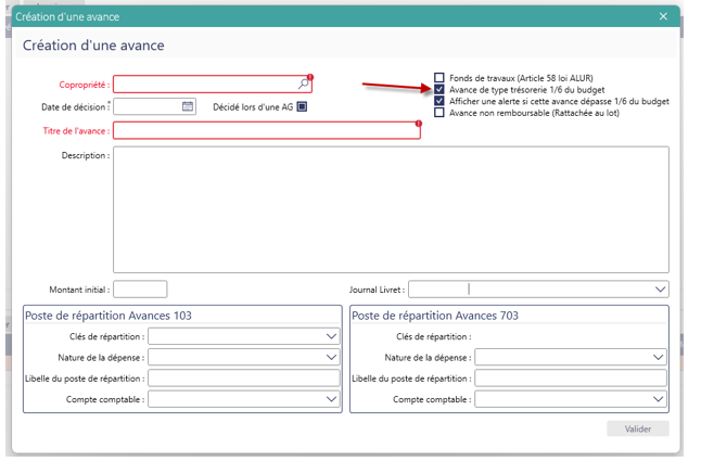 Avance de type trésorerie : cochez cette case, si cette avance correspond à une avance de trésorerie, lors de la répartition des charges le logiciel vous proposera de l’ajuster à 1/6ème du budget de l’exercice.
