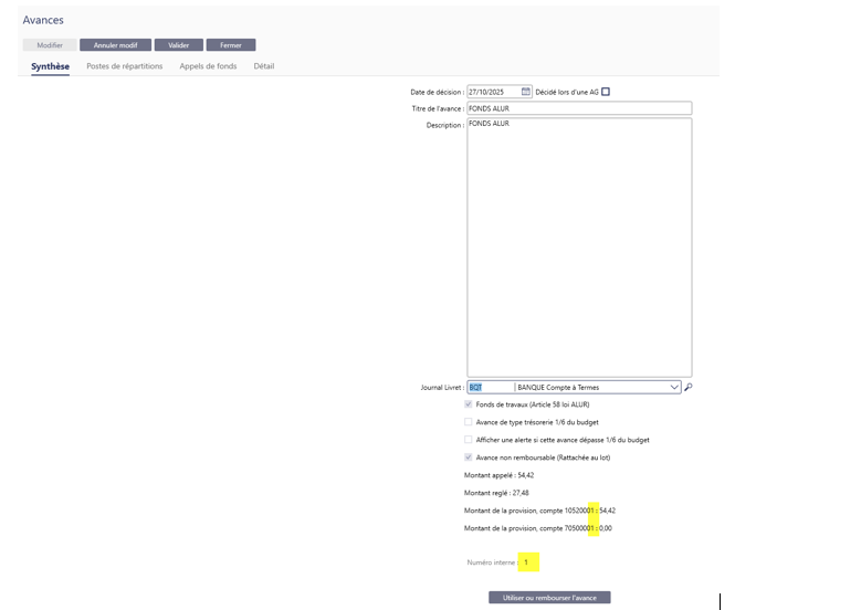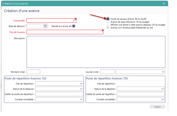 Fonds de travaux (Article 58 loi ALUR) : cochez cette case, si cette avance correspond à une avance fonds ALUR.