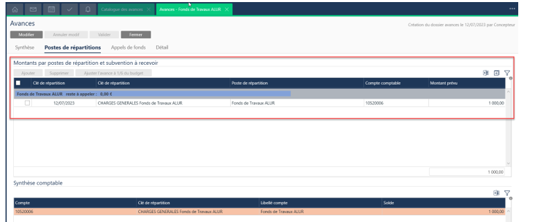 Lors de la création de la fiche avance un poste de répartition sera créé automatiquement sur la clé et avec le montant renseigné.