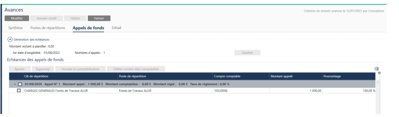 Dans le cas ou une seule fiche est utilisée chaque année pour l’appel des fonds Avance il faudra rajouter un poste de répartition avec le montant à appeler afin de générer les échéances d’appel pour l’année.