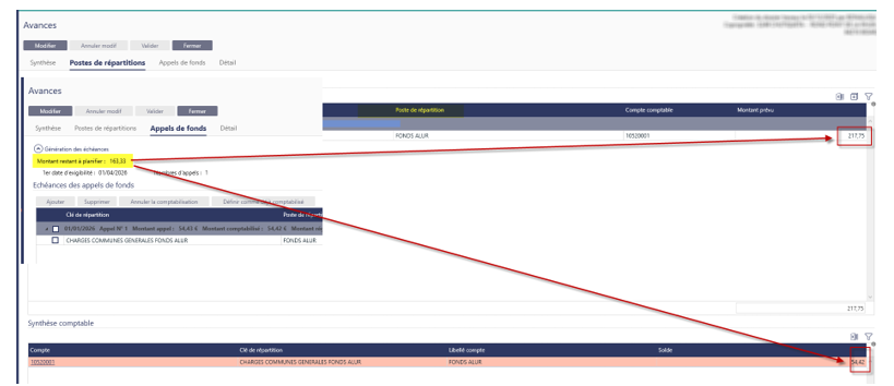 Le Montant restant à planifié correspond à la différence entre le Solde des postes de répartition et le Solde détenu sur le compte comptable (incluant les échéances non comptabilisées existantes).