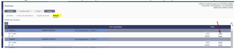 Sur cet onglet vous retrouverez la quote-part de l’avance de chaque copropriétaire détaillée par lot.