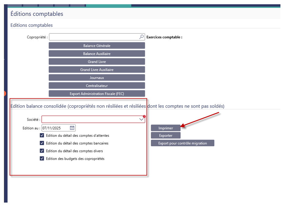 Comment éditer la balance consolidée ? Vous pouvez éditer la Balance consolidée depuis le menu Syndic-> Editions comptables -> imprimer une balance consolidée aux dates souhaitée.