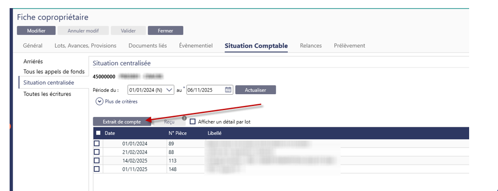 - Ouvrir la fiche du copropriétaire et aller dans l’onglet « Situation comptable » - Situation centralisée