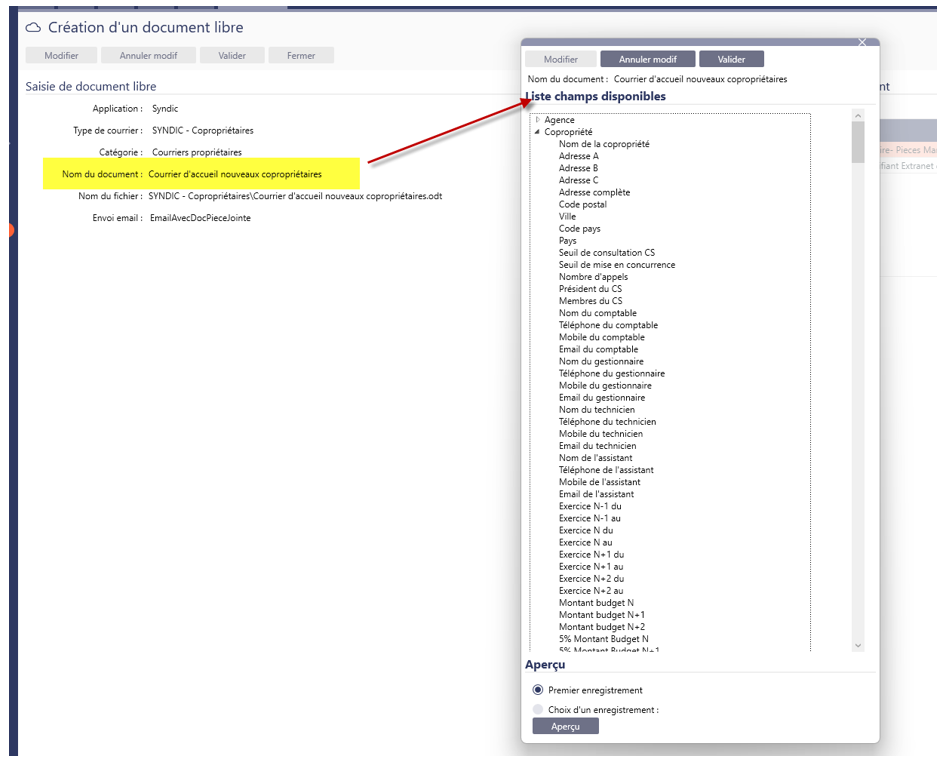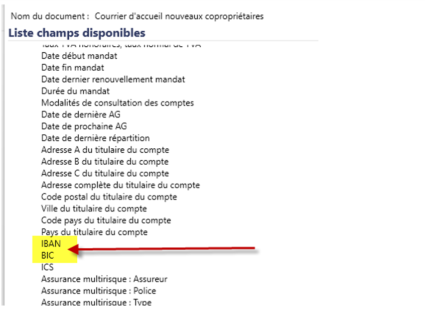 Soit le courrier est déjà existant et vous devez contrôler que les champs IBAN et BIC sont présents, soit il n’existe pas et il faudra le créer et ajouter les champs de fusions que vous souhaitez.