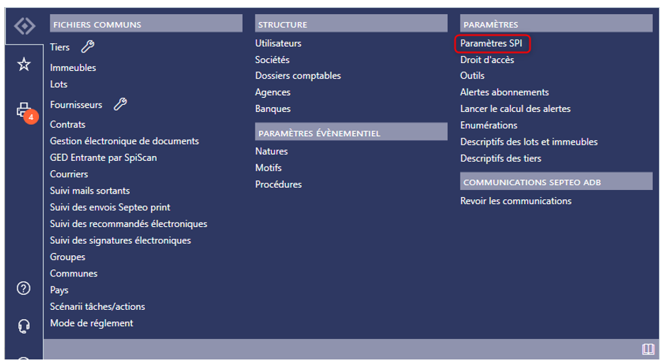Aller dans le Menu Commun (menu gris) et cliquer sur PARAMETRES SPI :