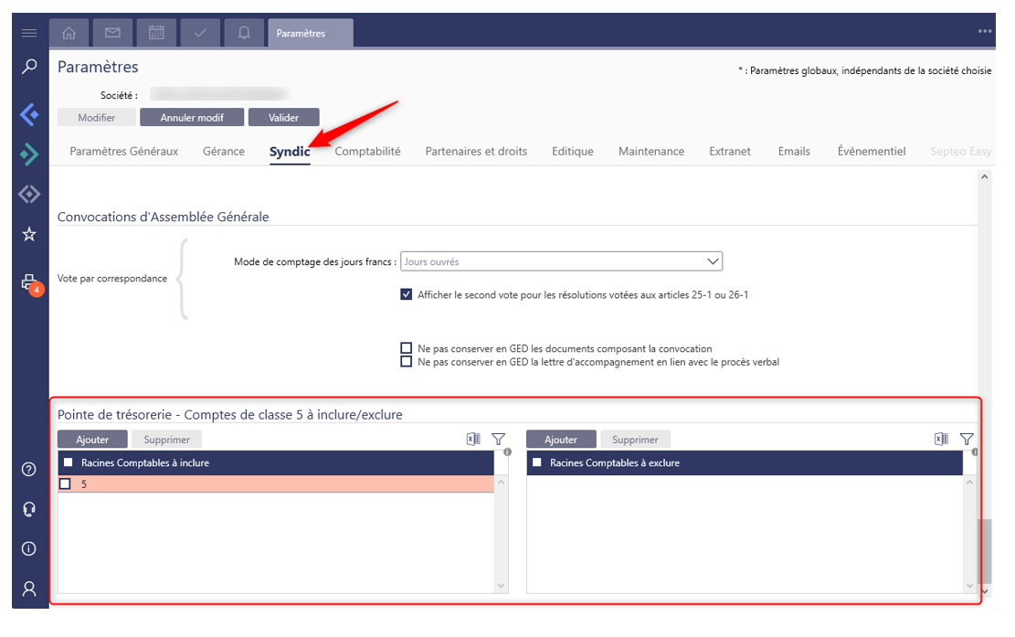 Cliquer sur l’onglet SYNDIC et descendez jusqu’au paramétrage de la pointe de Trésorerie tout en bas :