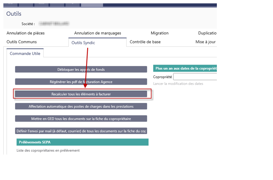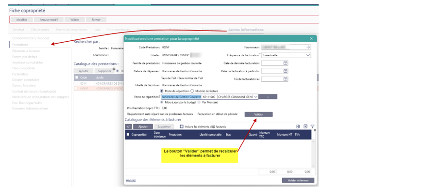 Relancer un calcul des éléments à facturer honoraires de gestion courante pour une seule copropriété depuis la prestation sur la fiche de la copropriété :