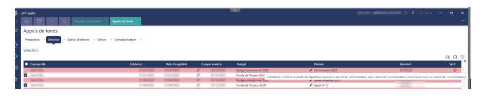 Pourquoi le logiciel affiche une échéance d’appel de fonds en rouge avec message « L'échéance contient un poste de répartition associé à une clé de consommation sans relevé de consommation. (Vous devez saisir un relevé de consommation) »?