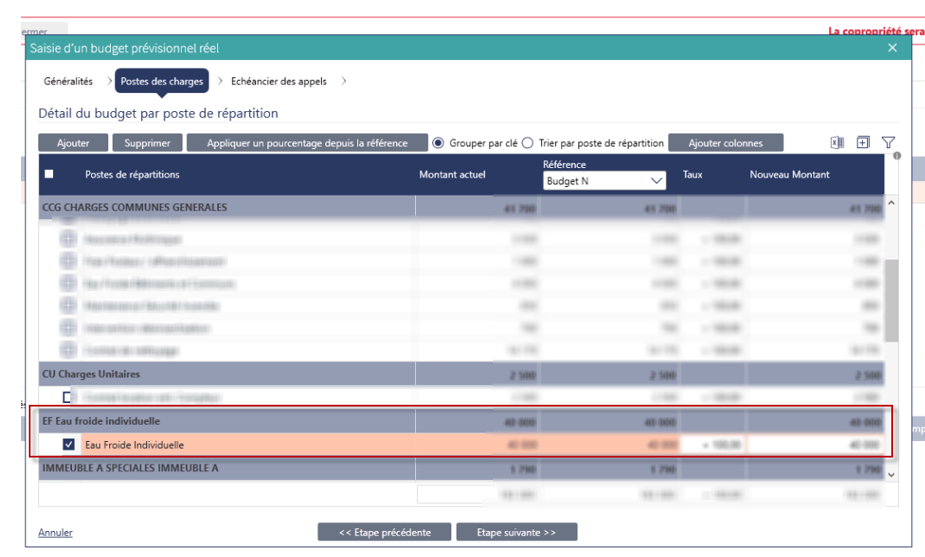 Lorsqu’un poste de dépense rattaché à la clé de consommation individuelle est budgétisé un relevé de compteur doit être saisi sur la clé de consommation afin de provisionner la dépense.